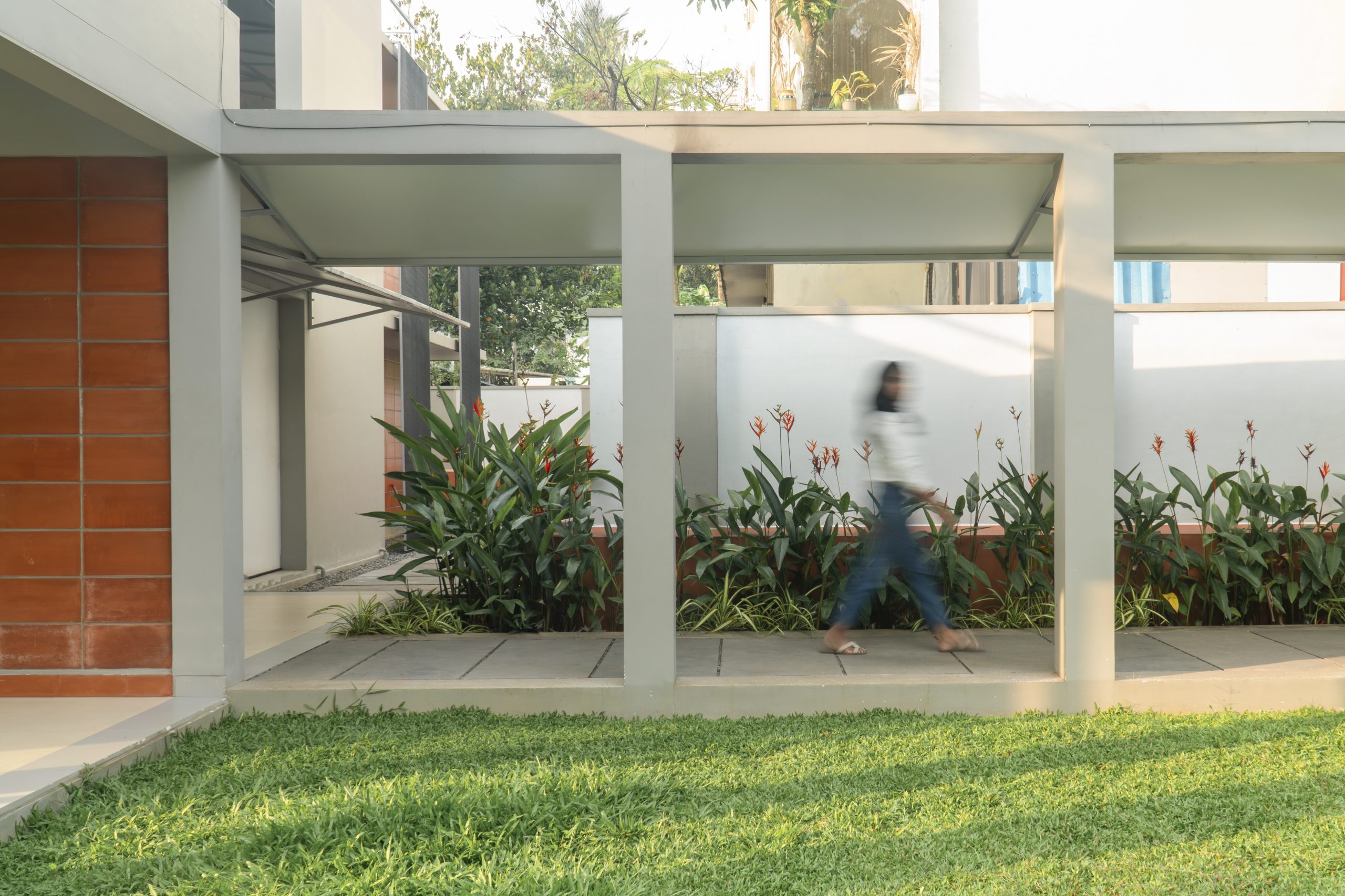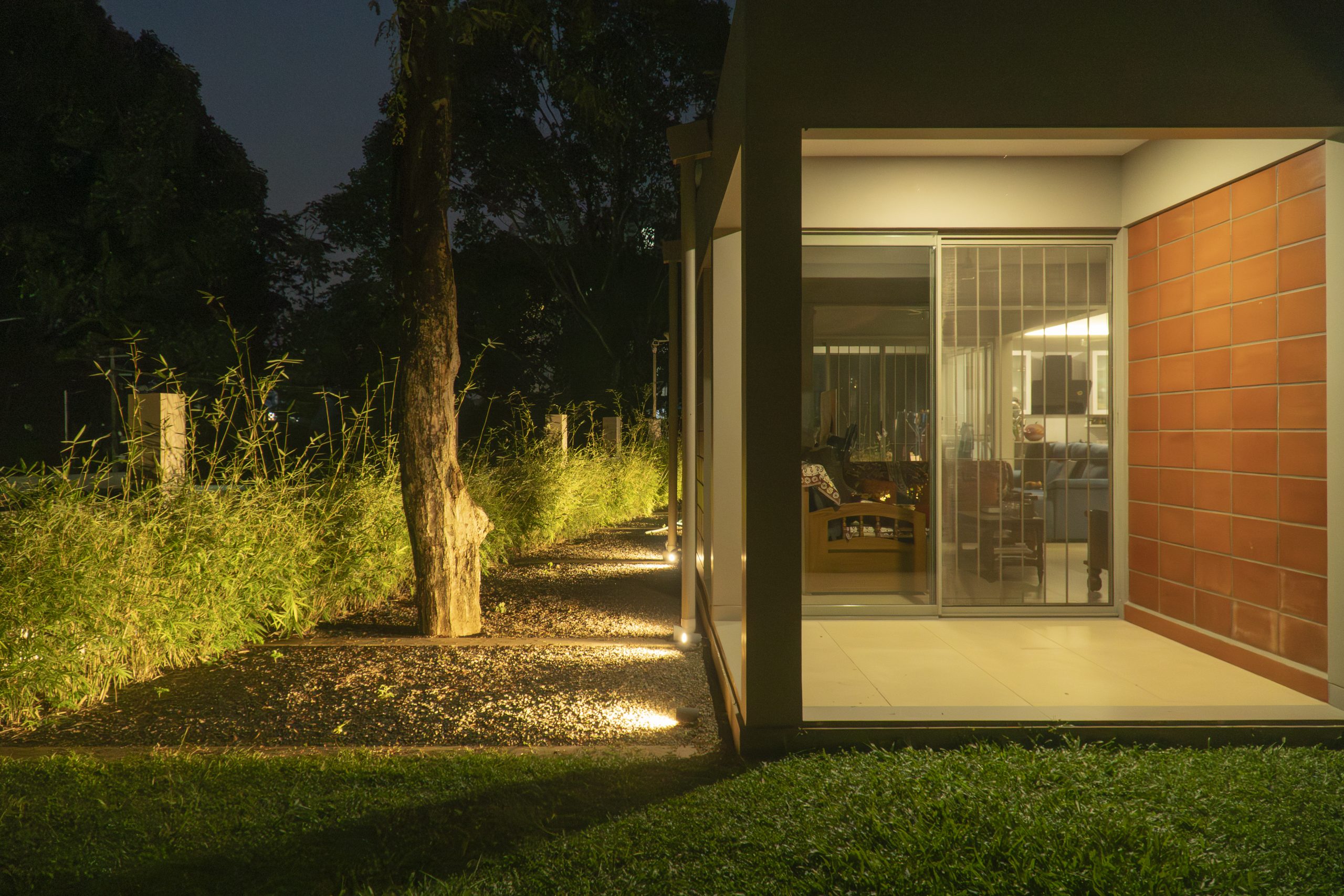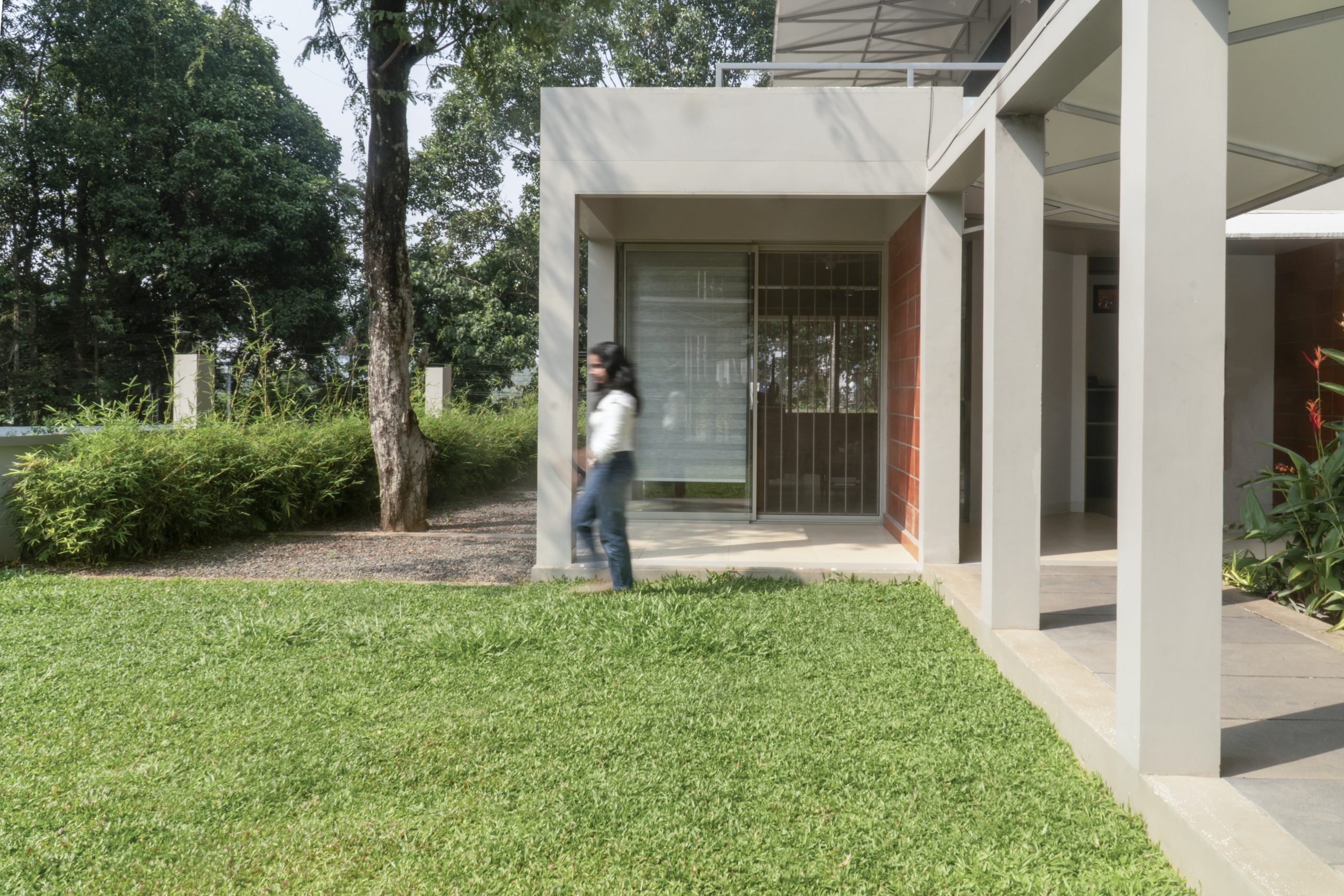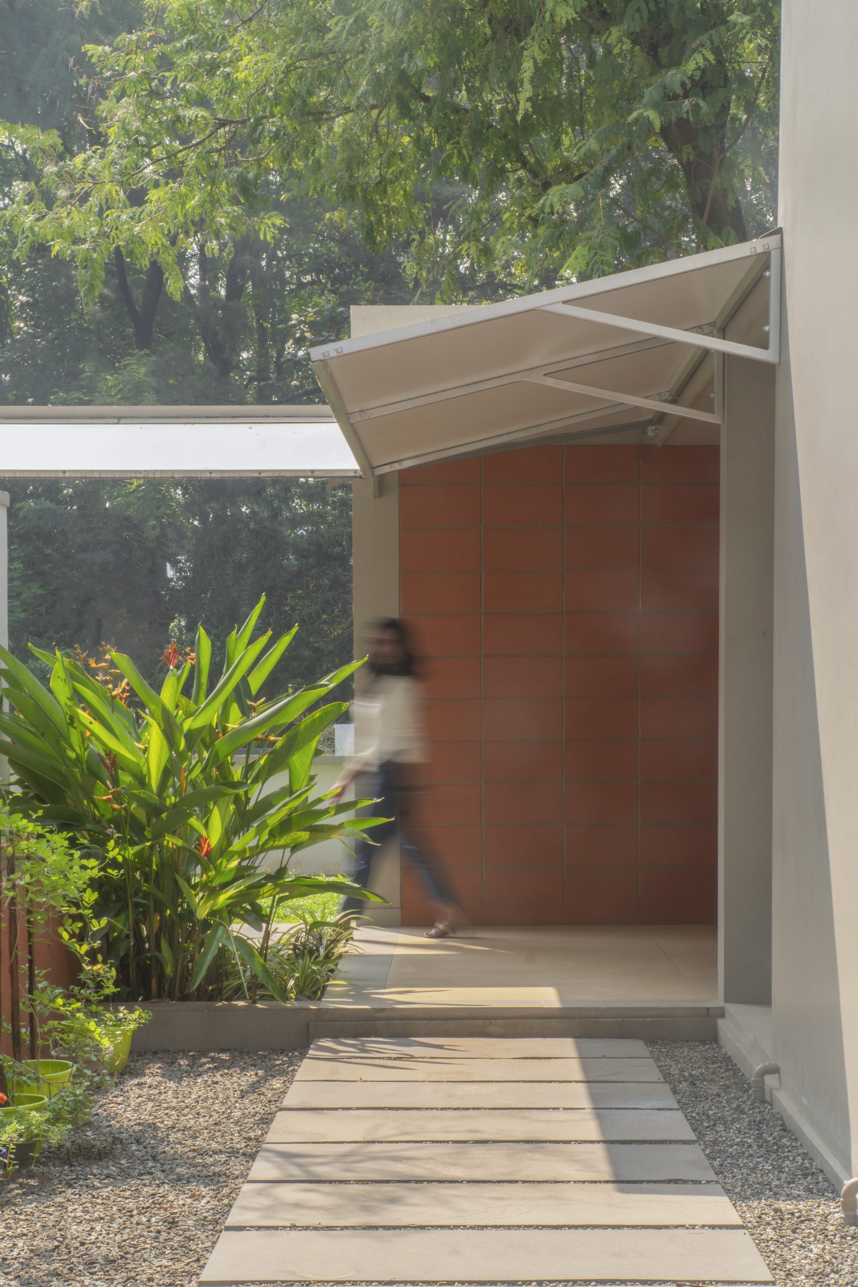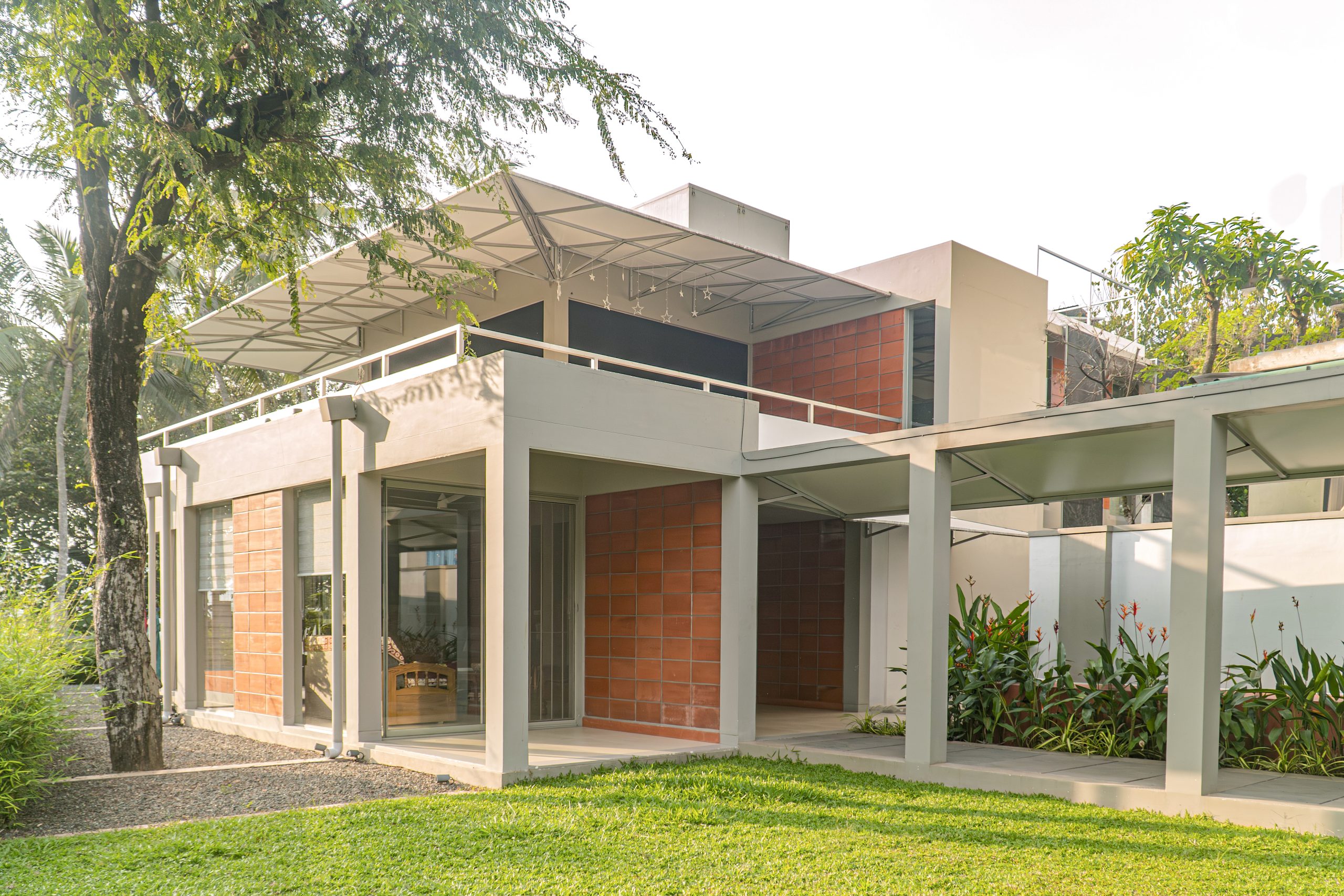 Features such as accessible doors, unhindered common areas, lift to access the upper floor etc. were incorporated into the design. An internal link in the form of a corridor is established between the master bedroom and the wheelchair user’s bedroom to allow easy movement. Every fixture in the accessible bathroom was planned to cater to the specific needs of the user. A centrally placed family living area with a double height ceiling enclosed by glass allows plenty of natural light. The use of exposed porotherm brick walls brings in warmth while the steel and fabric canopies alongside orchid netting offer shade & privacy.