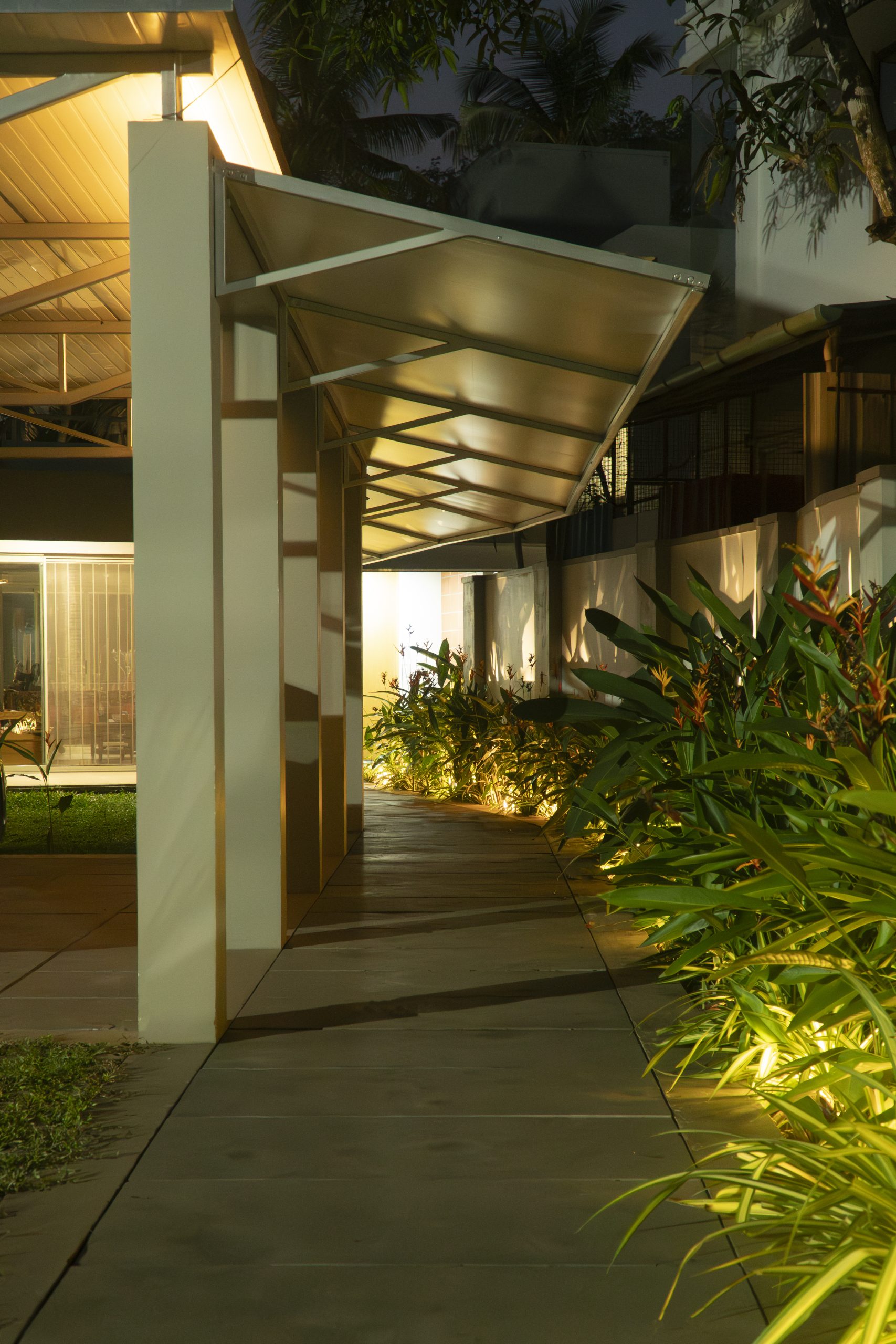 The site, located at Kakkanad, Kochi offers the benefit of a peaceful and serene environment for this family home. The residence is slightly elevated from the road level, with the car porch and walkway designed in such a way that these spaces are easily accessible.
